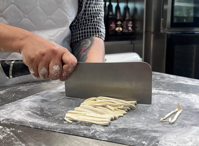 پس از مدت 40 دقیقه از آماده کردن خمیر رشته و استراحت کردن آن، خمیر را روی تختهای که روی آن نشاسته ذرت پاشیدهایم میگذاریم و آن را وردنه میکنیم و نشاسته میپاشیم. پس از یک دست شدن خمیر (به شکل مستطیل)، آن را دو دور روی هم میاندازیم و سپس با وردنه فقط یک فشار جزئی به آن وارد میکنیم. سپس با چاقو خمیر را نازک نازک ازطول میبریم تا به شکل رشته درآید.