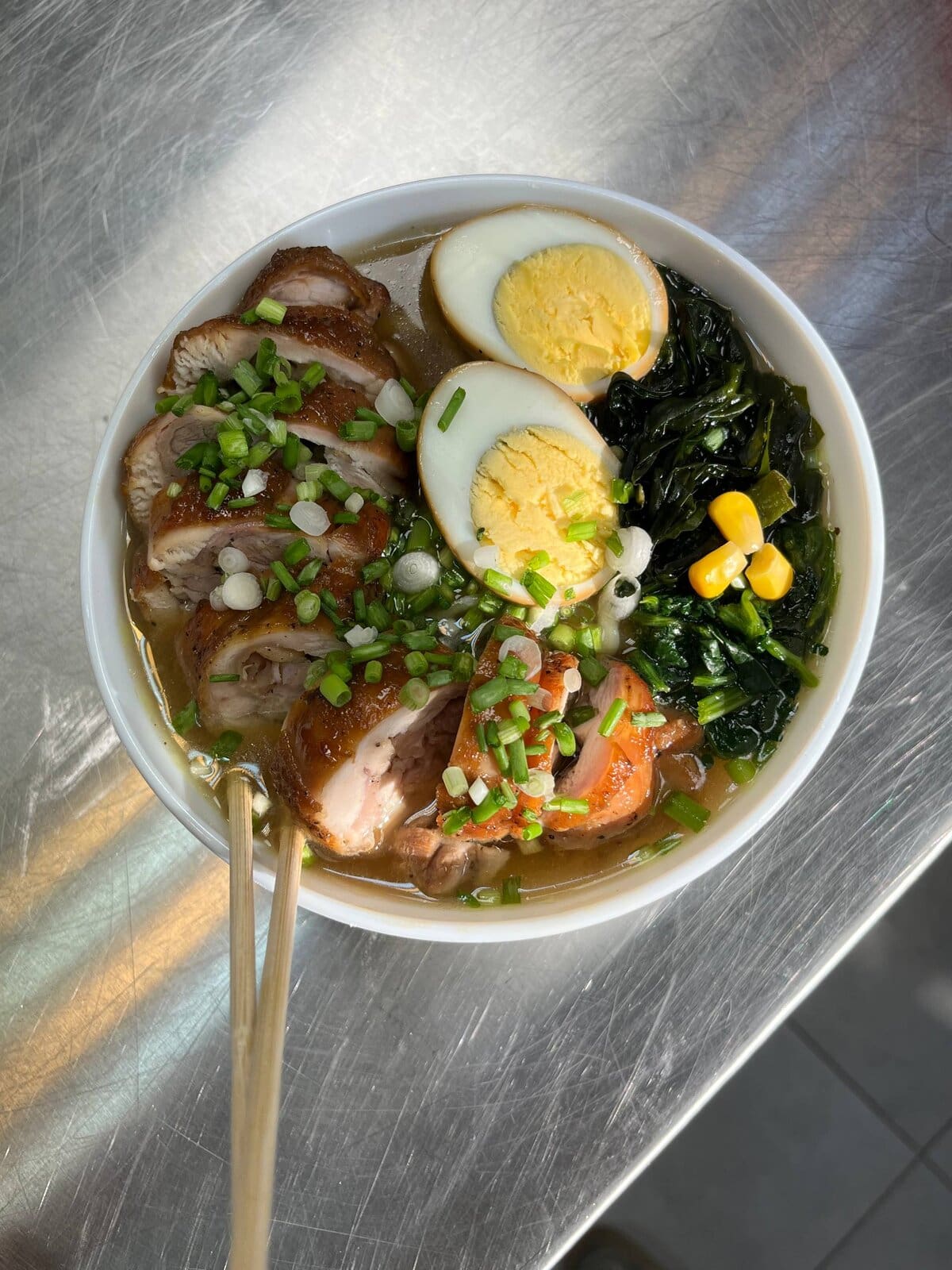 تخم مرغ آبپز را نصف کرده و به همراه واکامه خیس خورده و اسفناج بخارپز شده و ذرت و پیازچه خرد شده به رامن اضافه میکنیم.